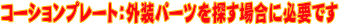 外装部品をお探しの場合、同じ色の部品を探すには各メーカーの車体に貼られている「コーションプレート」が必要です。中古部品を塗装するので同じ色である必要が無い場合は近似色をご指定いただくか、「色の指定なし」とお伝えください。