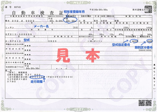 ![]() ●初年度登録 ●車名(メーカー名) ●型式 ●型式指定番号 ●種類区分番号 ●走行距離 |